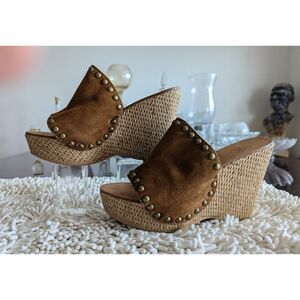 ASH Brown Suede Studded Platform Straw Wicker Wedge Heels Peep Toe Sandal
