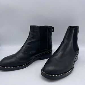 ASH WINONA Chelsea Boots Black Leather Booties. Heel height 1.25” and shaft height 5”. Size 37. Genuine leather. In good preowned condition but do have a small white stain on inside of right shoe, reddish marks on top by of left shoe, and minor scuffing.