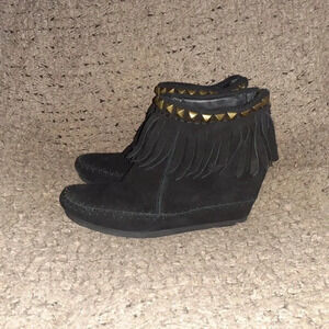 ASH Santa Fe Black Suede Leather Fringe Hidden Wedge Moccasin Boots