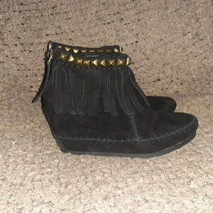 ASH-Black Suede Fringe Hidden Wedge Studded Moccasin Booties-Sz 37-Excellent