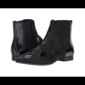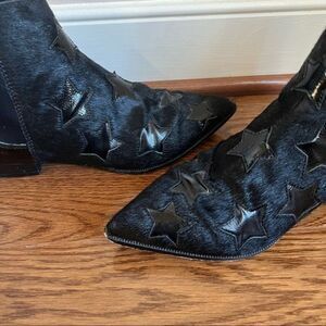 Patent and cow-hair upper with star patch embellishment. Pull-on construction with side-goring panels. Point-toe silhouette. Leather and textile lining. Lightly cushioned leather footbed. Low, stacked heel. Leather outsole. Imported. This product is made with real cow hair that has been dyed and treated