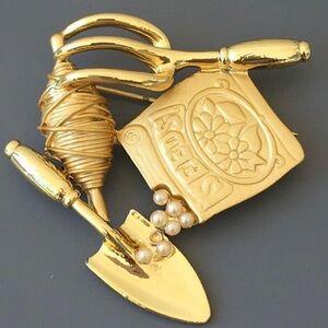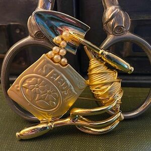 Vintage Ashley Cooper Gold Tone Gardening Tools and Dainty Pearl Flower Seeds Brooch Pin