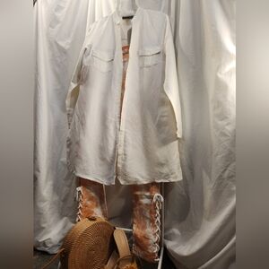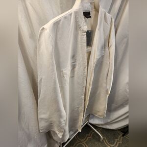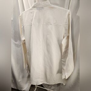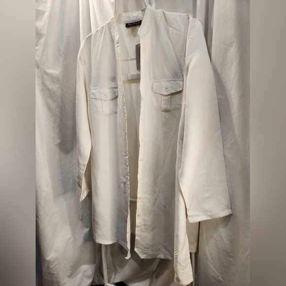 Ashley Stewart Creme Rayon Blend Long shirt with Nehru V neck collar and 7 button closure. 2 front button patch pockets and side splits. Sleeves are open split to the elbow with a single button at the cuffs. NWOT