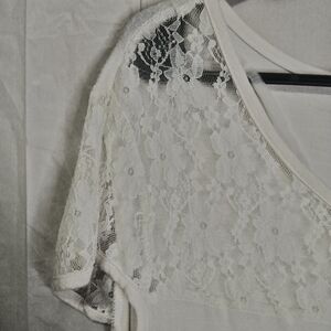 This top is perfect for any casual occasion. It features a lace yoke for a feminine touch, a peplum hem, and short sleeves.