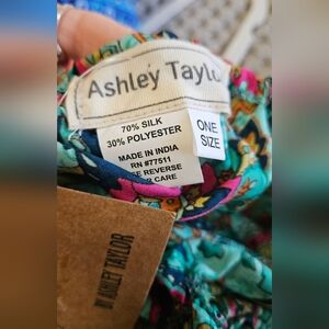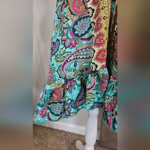 Elegant paisley dress in teal, pink, and yellow. Made from a silk blend.