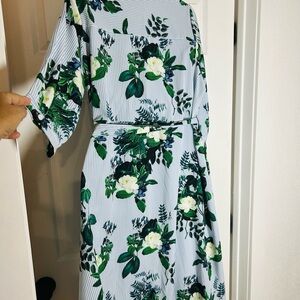 This stunning maxi dress showcases a vibrant green and white floral design, ideal for a wedding guest or cocktail event. Featuring a notched collar and 3/4 sleeves, it combines elegance with a relaxed fit. The flowing silhouette adds a touch of grace to your ensemble.