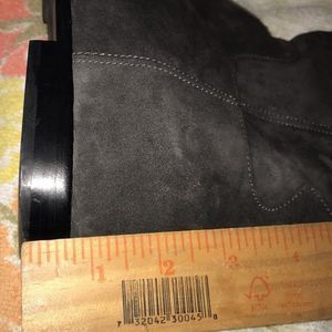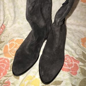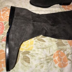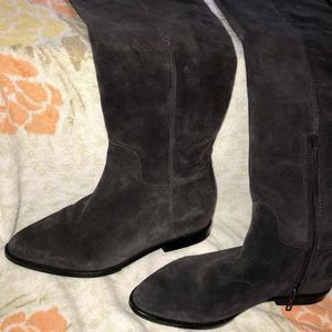 Gorgeous gray suede over the knee boots with hidden wedge. Flat sole. Shaft 22 in. Inner side zipper closure. Point toe. Size 40. Boots are in excellent condition with slight wear. Gorgeous.