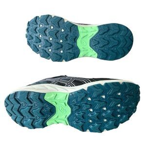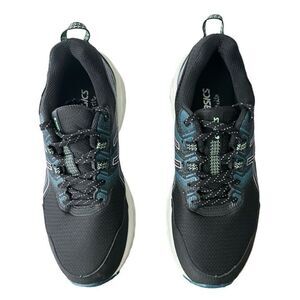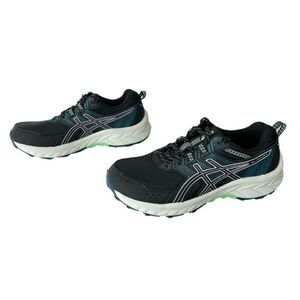 Stylish ASICS running shoes in black and teal. Perfect for athletic activities.