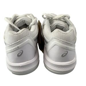 Keywords: ASICS GEL-DEDICATE 7, womens size 5.5, white silver tennis shoes, 1042A167, tag attached, synthetic leather, TRUSSTIC support, tennis performance, court shoes, lateral stability, wrap-up outsole, flexible construction, athletic shoes, tennis training, competitive tennis, sports footwear, locked-in fit, pickleball, pickleball shoes