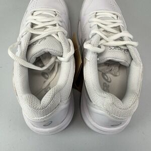 Description: ASICS GEL-DEDICATE 7 women's size 5.5 tennis shoes in white with silver accents featuring synthetic leather upper for support and stability. Style 1042A167 with tag still attached includes TRUSSTIC support unit and wrap-up outsole for confident direction changes on court. Flexible construction keeps feet locked-in during lateral movements and challenging shots. Designed for tennis performance with reliable court traction.