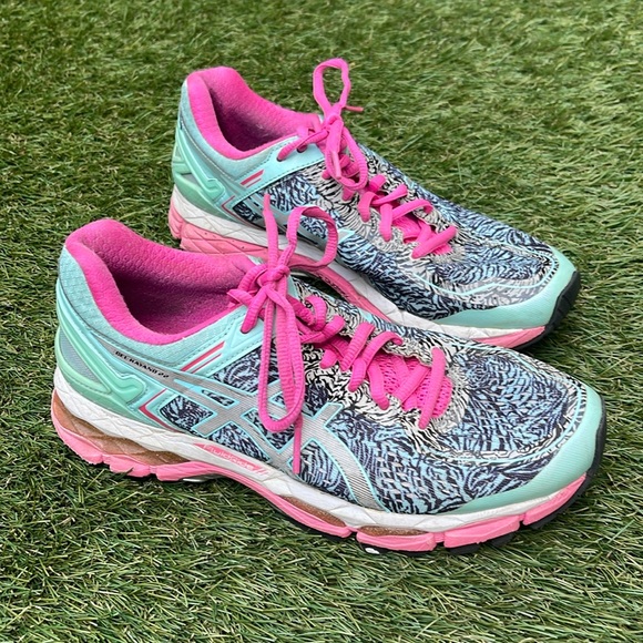 Women’s Asics gel, Kayano, rare color, so gorgeous must see to appreciate, turquoise and hot pink no insoles I used my orthotics in them but lots of life left.