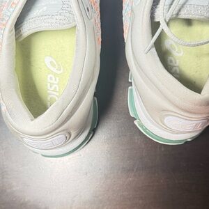 Vibrant ASICS shoes with orange and green design. Perfect for athletic activities. Comfortable and stylish.