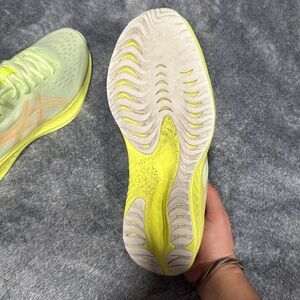 Light green ASICS shoes with orange accents. Perfect for running. Stylish and comfortable. Original Insoles.