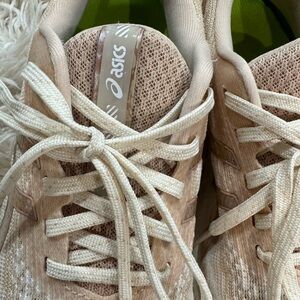 Light beige/peach ASICS Gel-Quantum 360 knit running shoes with cushioned soles and breathable mesh upper. Stylish & supportive with visible signs of wear but plenty of life left. Perfect for gym, walking, or everyday comfort.