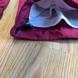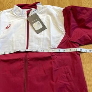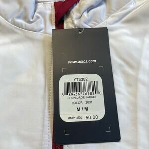New with tags red and white Upsurge Jacket from ASICS, size youth M. The Jr. Upsurge jacket offers classic style with modern details. Convenient zipper pockets, an adjustable waistband and performance fabric make it the ideal layer for travel, warm-up and cool-down.