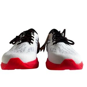 Dynamic ASICS athletic shoes. White upper with bold red accents. Ideal for high performance.