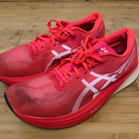 ASICS Metapseed Edge. Size 11.5mens. Good condition, very little mileage. Please note: heel on left shoe has foam scuffs. Fast race shoes for race day or speed work. Comes from pet/smoke free home. Comes without original box.