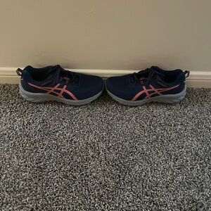 Stylish navy athletic shoes with pink accents. Perfect for running or casual wear.