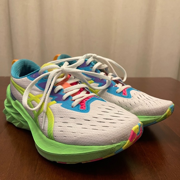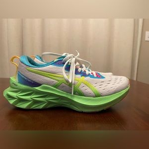 ASICS NovaBlast 2 in White/Safety Yellow color. Sold out in all sizes. This is women’s size 6.5 and 23.5cm length. No damage at all, just worn couple times for running with my dogs. This is the best cushion ever i ran with even all day at the zoo. I just need to size it up and this shoe needs some love!