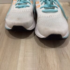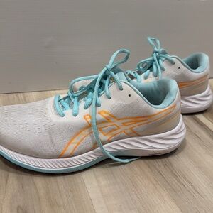 UC/ASICS GEL EXCITE 9/SIZE:8.5/AMOLIFOAM/WHITE SHOE/BABY BLUE LACES/ORANGE ACCENTS/PLETNY OF MILES LEFT