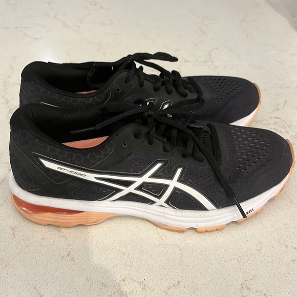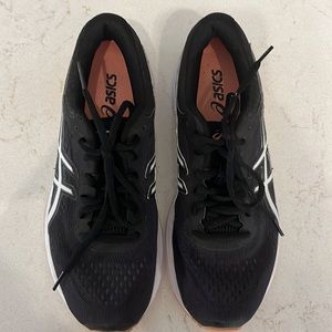 Black, White and Pink ASICS running shoes. In good condition. Inside on souls, there are some black specs that are pictured.