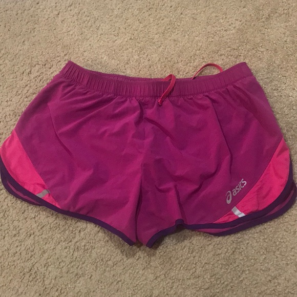 Tri-colored (pink, magenta, purple) running shorts. Gently worn and in excellent condition. Hidden change pocket inside with drawstrings