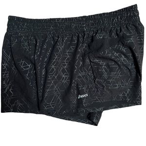 ASICS running shorts in black with geometric design in silver. Mid-waist. One side pocket with zipper for small items like a key, with mesh panels on both sides. Has a liner and a tie for tighter fit. Small reflective panel on back. Barely worn considering I gave up running almost as soon as I started.