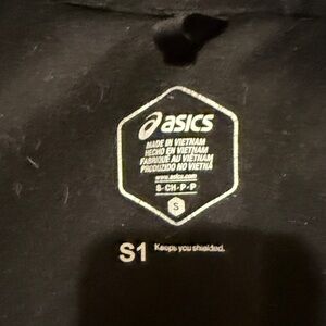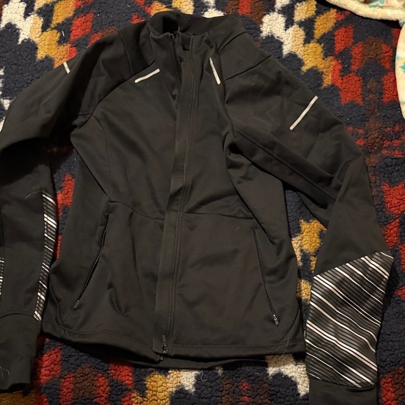 Sleek black jacket with reflective markings for running. Warm and form fitting, fleece inside. Have too many jackets, may fun a little small.