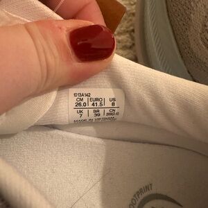 New never worn. Women’s 9.5, men’s 8. White, gray, and frost blue.