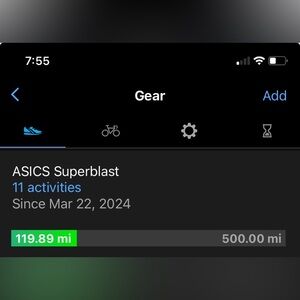 ASICS Superblast running shoes. Shoes have 120 miles on them. I ran a few short runs, a couple of 20 milers and a marathon on 4/27, which was the last run in these shoes. I bought them primarily for long runs, but they are not what I had hoped for. These come from a smoke free and pet free home.