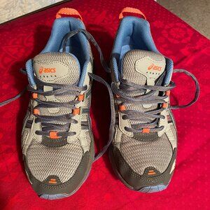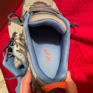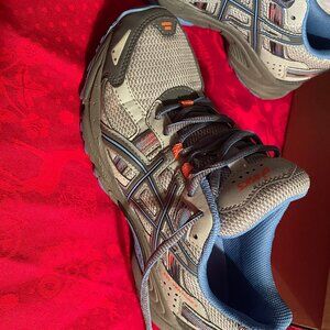 SIZE 7 BLUE AND GREY ASICS WOMANS GEL VENTURE 5 RUNNING SHOES. T5N8N. EXCELLENT CONDITION GENTLY USED A COUPLE OF GYM VISITS. HAS ASICS BOX.