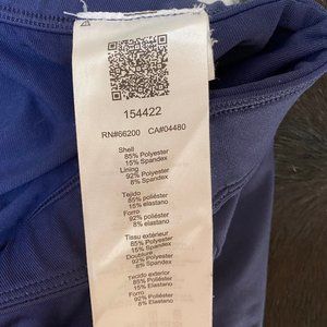 Gorgeous details on this pre-owned active skirt. The color is bright navy with white piping detail on the front edge. The style is wrap on the front and back. The shorts extend slightly below the skirt which is about 13" in length.