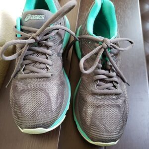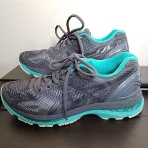 ASICS gel nimbus 19 lite show running sneakers size 8. The GEL-Nimbus 19 shoe features our revolutionary FlyteFoam Technology, for optimal comfort and a responsive ride for the neutral runner. A gradient jacquard-mesh upper is strategically tightened or loosened in zones to allow the foot's natural motion. 3D printed overlays provide support. Color: gray, green, reflective.
