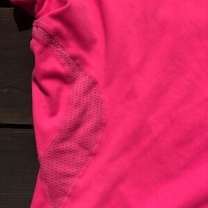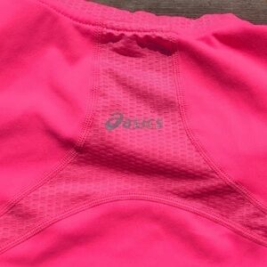 Neon pink Asics shirt sleeve shirt. Mesh contour panels on sides, back and sleeves.