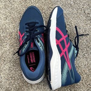 Blue and pink ASICS running shoes. Only worn once but were too big. Everyday comfort foam inside. US 9