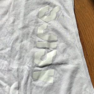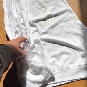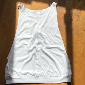 White workout top by ASICS. White logo down left front Dropped armholes with opening beneath Worn once