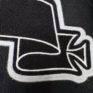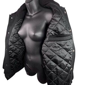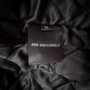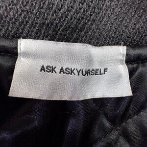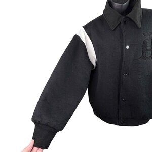 Awesome, Ask Yurself, street wear, “Banned Varsity Jacket”. Cotton fabric. Dropped shoulders. 90s cropped fit. Vintage faux leather details. Quilted inner/pockets. Side pockets. Silvertone button snaps. Embroidered logo/graphic design patch. Heavy jacket. On the back left side arm the material has small damage - see pic.