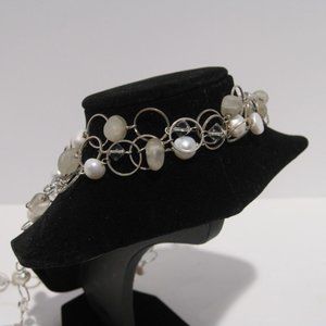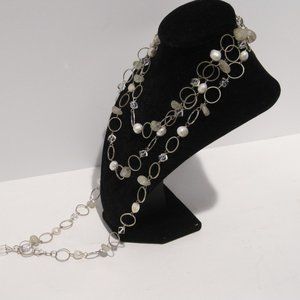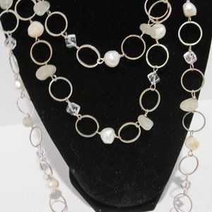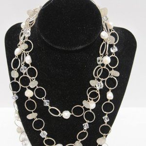 ASKA Long Chain Layered Necklace Silver Toned White Beads Clear Square Pendant