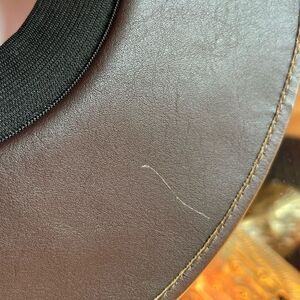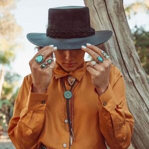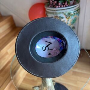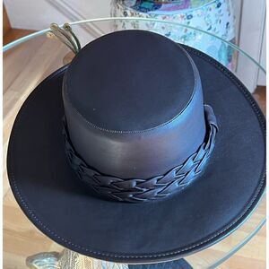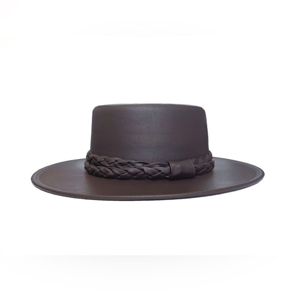 The sculpted crown and brim of the Coffee hat is swathed rich Tabacco faux leather and complemented by a statement braid. It draws design influence from the classic Spanish boater hat.