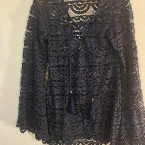 Stylish navy lace cover-up with bell sleeves. Perfect for beach or poolside.