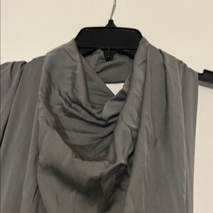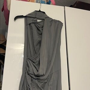 Maxi dress. Side zipper and gorgeous flowing, flattering draped front. Left arm and back is open and secured at neck with hook and eyes. Side slit. Stunner