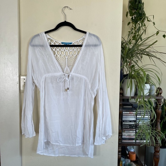 White thin cottony fabric. Bell sleeves, giving very much 70s vibes. Crochet design on the back. Can be a dress or a swim cover! Two beads on the front.