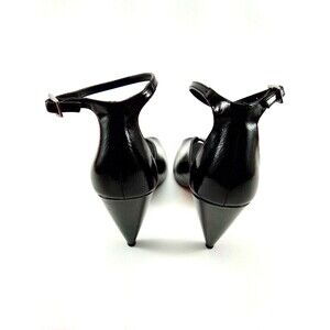 These are ASOS black patent leather heels with a 4'' cone heel. They feature a peep toe design, ankle strap with buckle closure, and a comfortable faux leather insole. Ideal for various occasions like travel, parties, work, and more. The shoes have a stylish logo accent and are suitable for seasons throughout the year. Made for women's standard width and size 7 (US)/5 (UK)/37 (EU)/5 (AU). Made in Vietnam.