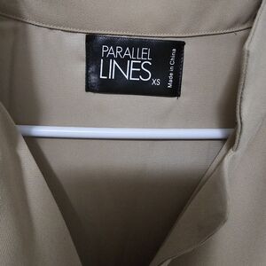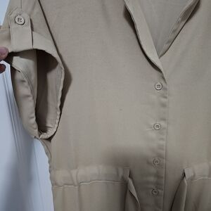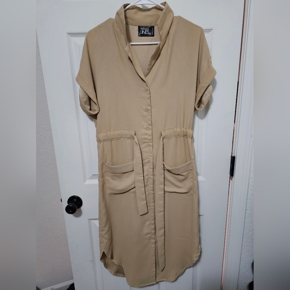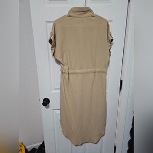 Stylish beige dress with button-up front. Features short sleeves and two front pockets. Has a tie-able waist band for added shape and rounded hems for added style.