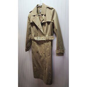 This timeless beige trench coat offers a classic look with its double-breasted design and belted waist for a tailored fit. Constructed from durable cotton, it provides both style and functionality, suitable for professional settings or a polished casual appearance.