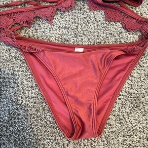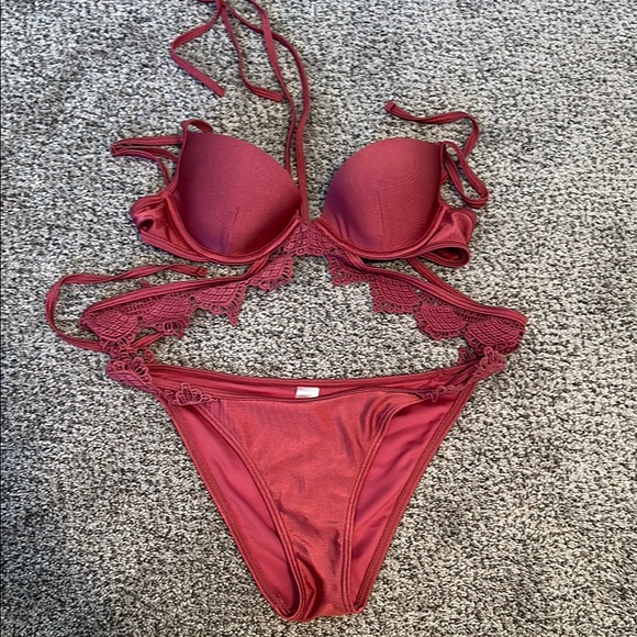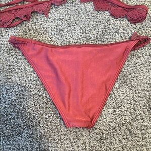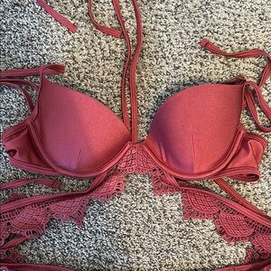 Stylish deep pink bikini set from ASOS. Features lace detailing and adjustable straps. Perfect for beach days.