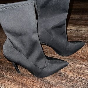 Chic black heeled boots. Sleek design with pointed toe. Ideal for stylish outings.