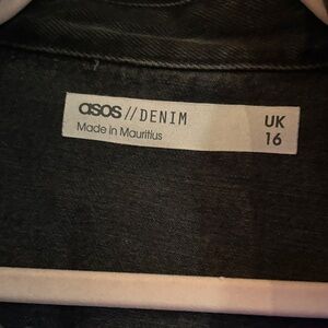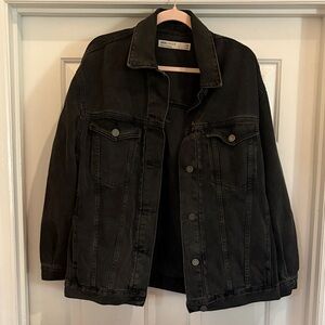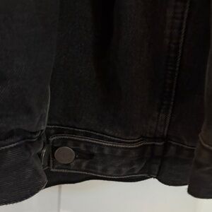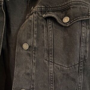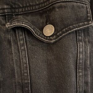 Stylish black jean jacket. Classic design with button closure. Front pockets for convenience.