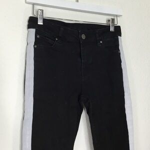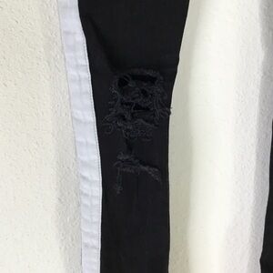 A black pair of jeans with a white strip down the side. A decent amount of stretch and fashion rips on the front. Real pockets.