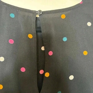 Adorable mini dress with great bell sleeves. Polka dots are different colors. Would be adorable as is or with tights. Back has a keyhole with a button closure. Has a fun retro vibe.